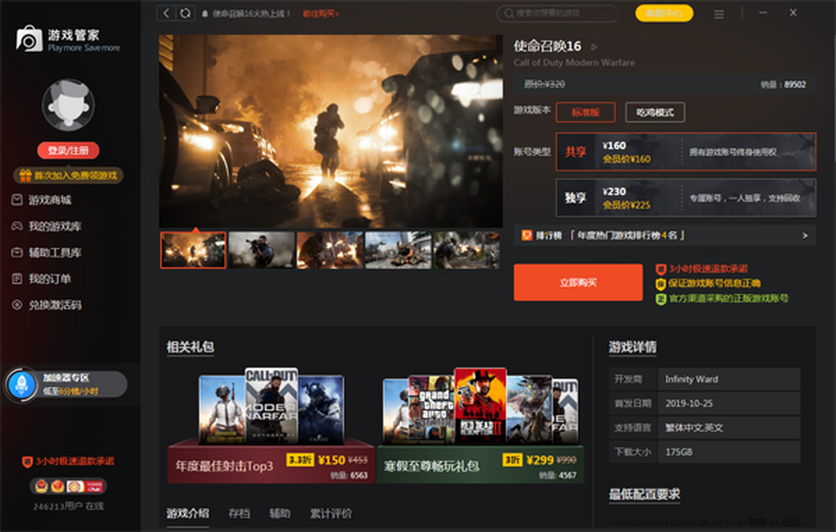《使命召唤16:现代战争》(Call of Duty: Modern Warfare)是一款由Infinity Ward开发,动视发行的第一人称射击游戏,也是使命召唤“现代战争”系列的重启之作。本作于2019年10月25日正式发售,登陆PS4、Xbox One及PC平台,其中PC版本由战网独占 。从9月12日起,《使命召唤16:现代战争》进行了玩家测试,直至9月23日为止,创造了三项历史最高纪录。在进行测试期间,创造了系列历史以来测试版PS4,Xbox One,PC平台参与玩家数、总游玩时间和同时在线人数的三项最高纪录。《使命召唤:现代战争》大逃杀模式 “战区”正式公布,该模式将向所有玩家免费开放,并且支持跨平台游玩,同时没有《使命召唤:现代战争》游戏本体的玩家也可游玩。